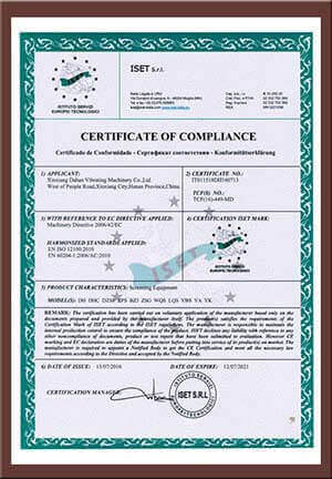 大漢螺旋輸送機設備及振動篩設備先后通過了ISO質(zhì)量體系認證和歐盟CE認證