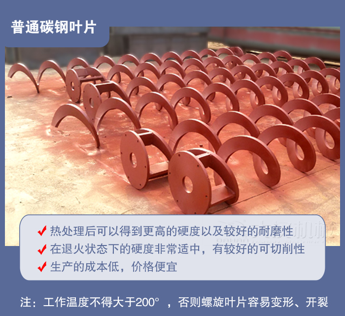 螺旋輸送機(jī)應(yīng)用廣泛,常用于物料的輸送,塊狀、顆粒狀、粉狀等物料,或者一些高溫、腐蝕物料,代替了人工的搬運(yùn),效率更高。常見的螺旋葉片有普通碳鋼葉片,高錳鋼葉片以及不銹鋼葉片。