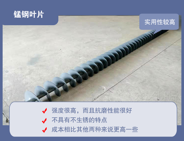 錳鋼螺旋輸送機(jī)葉片的強(qiáng)度很高,而且抗磨性能很好,主要是由于錳鋼的錳元素,而錳鋼不具有不生銹的特點(diǎn),與錳鋼相比,不銹鋼的抗氧化性能以及耐腐蝕性能就很好了,但是強(qiáng)度沒有錳鋼好。