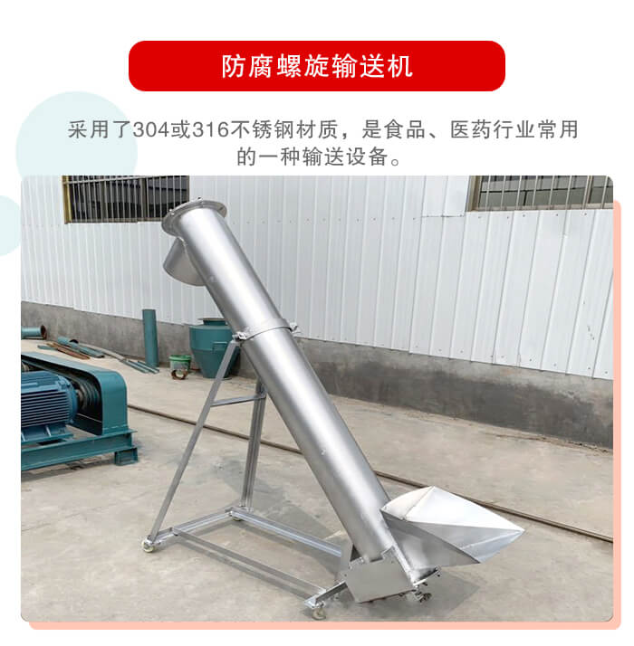 防腐螺旋輸送機(jī)采用了304或316不銹鋼材質(zhì),是食品、醫(yī)藥行業(yè)常用的一種輸送設(shè)備,今天小編就來為大家介紹一下防腐螺旋輸送機(jī)的特點(diǎn)及適用范圍: