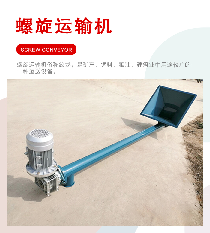 螺旋運輸機俗稱絞龍,是礦產、飼料、糧油、建筑業中用途較廣的一種運送設備,從運送物料位移方向的角度區分,螺旋運輸機分為水平式螺旋運輸機和筆直式螺旋運輸機兩大類型,首要用于對各種粉狀、顆粒狀和小塊狀等松散物料的水平運送和筆直提高。