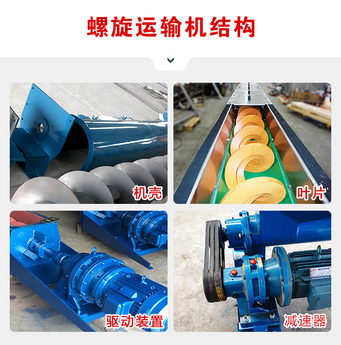 螺旋運輸機一般由運送機本體、進出料口及驅動裝置三大部分組成;螺旋運輸機的螺旋葉片有實體螺旋面、帶式螺旋面和葉片螺旋面三種方式,其中,葉片式螺旋面應用相對較少,首要用于運送粘度較大和可壓縮性物料,這種螺懸面型,在完成運送作業過程中,一起具有并完成對物料的拌和、混合等功用。