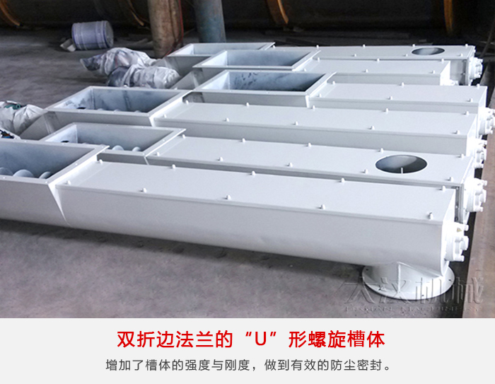 槽鋼“U”形螺旋槽體適用于輸送機支承間距要求長的場合。槽體的上邊由結構槽鋼制成,可用螺栓或彈簧卡子與下部半圓形截面的槽體連在一起。