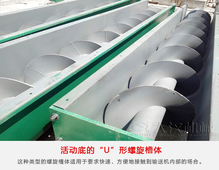 這種類型的螺旋槽體適用于要求快速、方便地接觸到輸送機內部的場合?;顒拥椎腢形螺旋槽體由上部剛性的槽鋼與下部半圓形截面槽上體所構成,半圓形截面槽體的一邊為鉸接面,另一邊則采用彈簧卡子夾緊或其他形式能快速打開的連接裝置。
