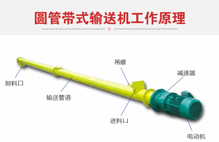 圓管帶式輸送機是依靠電機帶動螺旋回轉,對物料進行推移以實現輸送目的的一種連續輸送設備,可以水平、傾斜、垂直輸送粉末、顆粒及小塊狀物料。具有結構簡單、橫截面積小、密封性好、操作方便、維修容易、便于封閉運輸等優點。